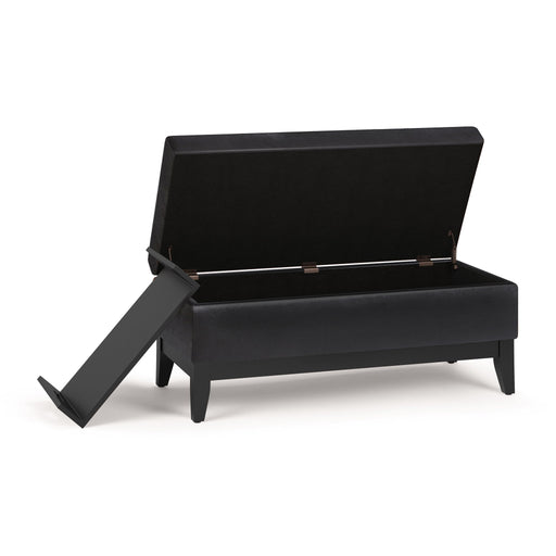 Simpli-HomeHand constructed using solid wood, engineered wood, and high-density foam. Upholstered in a durable Midnight Black Vegan Faux Leather with stitche...