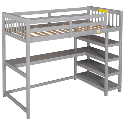 Hearth and HavenWorkstation Included: Features a built-in desk and storage shelves beneath the bed for organized living Durable Construction: Made with solid pine...