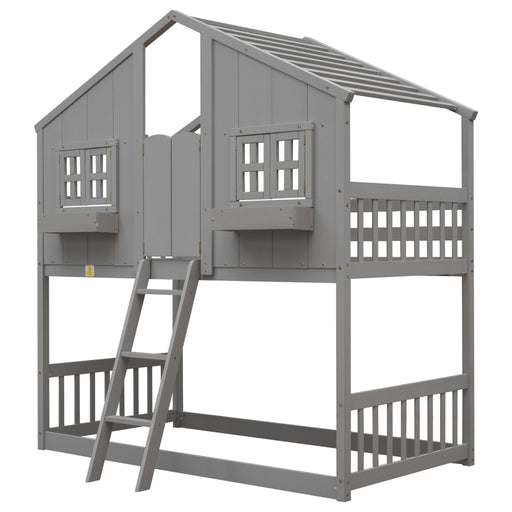 AcmeCharming Cottage Design: This twin-over-twin bunk bed features a delightful cottage style, complete with a doorway, two windows, and an open ...