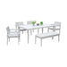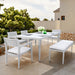 - Two-Tone Elegance: Sleek rectangular matte white tabletop paired with grayish frame, complemented by matching gray-framed chairs with white canvas cushions.