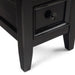 - Transitional design includes tapered legs, molded crown edged table top, panel framed drawer fronts and antique bronze round decorative knobs