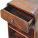 • Artisan Furniture Solid Wood Aspen Open Bedside - Meet the Aspen Bedside, a chic piece crafted from 100% solid mango wood in a rich chestnut finish. It has 1 drawer and 2 open slots, and its smooth corners ensure safety, while its modern design effortlessly harmonizes with various furniture styles. Ideal for adding elegance and convenient storage beside your bed, the Aspen Bedside is a timeless choice for any bedroom.
