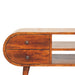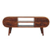- Chestnut Circular Media Unit - This round style media unit has been constructed from 100% solid mango wood. It features 2 open slots and 4 drawers which provide great storage and will come in handy in the living room. Some other features include 4 Nordic style legs and shiny knobs on the drawers. It can be used alone or be partnered with the other rounded furniture pieces from the collection.