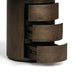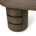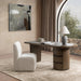 This striking desk is crafted with reclaimed oak veneer, showcasing the natural beauty of sustainable wood. Its asymmetrical design features a sturdy angled leg on one side and a rounded pedestal base with three curved drawers on the other, offering both style and storage. The warm finish highlights the oak’s organic grain, while the functional drawers provide ample space for organization, making it a sophisticated yet practical workspace solution.