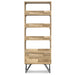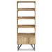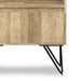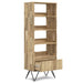 - Features a spacious drawer with metal drawer glides for concealed storage and three (3) large shelves and black metal hairpin legs