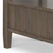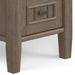- Transitional design includes grooved detail on front drawer, sides, brushed bronze handles, square tapered legs and square edged table top