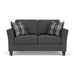Libby is a transitional stationary style with clean lines and graceful curves. Its off-the-floor frame is complimented by square tapered legs. This loveseat features an elegant roll arm with a detailed welt trim. Two square accent throw pillows are provided. The posh and plush style of Libby fits in with many home décor spaces.
