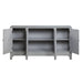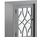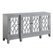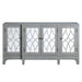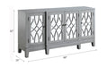 - Design Features: The Magdi Antique Gray Finish Console Cabinet boasts a stylish design with 4 mirror-front doors and patterned detailing. It stands on tapered legs, adding an elegant touch to any room.