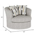 - The Myles swivel chair brings a sense of relaxed sophistication to your space. The chaise sectional, featuring contemporary tufting on both cushions and frame and sturdy solid wood legs, strikes a balance between modern design and lasting comfort. A storage cocktail ottoman keeps essentials close at hand yet out of sight. A roomy swivel chair invites you to sink in and unwind, offering a cozy spot to relax or enjoy conversation. Upholstered in light gray chenille with a faint patterned texture, this contemporary collection is designed for spaces where style meets everyday living..
