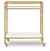 Store and serve in sleek style with this bar cart. Its casually cool design combines an antiqued brass-tone frame with white marble and clear glass. Rails on the top shelf help bottles and shakers stay organized. And with its rolling casters, you can make your at-home mini bar mobile and bring the party where your guests gather. It can also act as a cute coffee station—perfect for storing syrups, mugs and other must-haves for your morning brew.