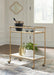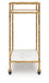 | Details | Made with sand casted aluminum, Antiqued brass-tone finish, White marble lower shelf, Clear glass top shelf, Casters for mobility, Color variations, fissures, mineral deposits and veining in the marble shelf are naturally formed characteristics, Assembly required | |
