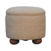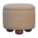 - Features: storage stool, boucle, cream, footstool, living room, ball feet, upholstered, solid wood, mango wood, accent piece