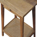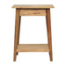 - Artisan Furniture Solid Wood Woven Solid Wood End Table - This end table is the perfect addition to any room. Suitable for narrow hallways as an ideal place to store small items like keys and address books. It is constructed from 100% solid mango wood and has a lovely oak-ish finish with a jute bottom shelf. Other features include tapered legs and a round shiny knob for the drawer.