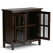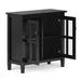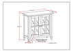 - Features storage compartment with two adjustable shelves behind wood framed tempered glass door