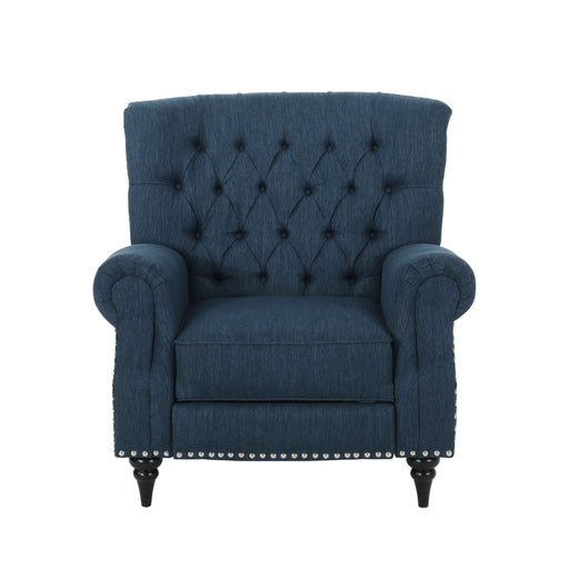 Noble HouseContemporary Design: This recliner blends modern elegance with deep button tufting, rolled armrests, turned legs, and sleek nailhead trim for a re...
