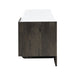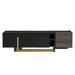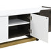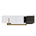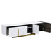 • Modern & Elegant Design:The TV cabinet and coffee table set feature a striking contrast between white surfaces, classic wood grain, and gold details. The sleek metal L-shaped frame and clean lines create a sophisticated.