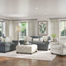 High contrast and eye-catching patterns make the Royce collection an extraordinary transitional design. The closer you get, the more the details come alive from the abstract leaf print on the ottoman and pillows, to a linear geometric print on the accent chair and additional pillows, and an unforgettably cozy boucle kidney pillow. All these creamy-toned pillows flatteringly coordinate with the cool gray body fabric on the sofa and loveseat. Finished off with welted details and classic rolled arms, the Royce will be the timeless additional to your home.