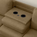 Masquerading as a straightforward chofa and ottoman, the contemporary Dawson disguises easy comfort. The chaise can switch between the left or right side so you don’t have to commit to a one room layout. Tuck blankets and pillows into the storage ottoman at the ready for curling up cozy. Push it up against the loveseat to instantly create additional leg space while you drop down the center back cushion to reveal two cupholders and USB-A and -C ports just waiting for you to binge watch your new favorite show. Wrapped up in a warm brown faux leather, Dawson is the ultimate in casual, effortless style with convenience.
