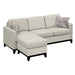 Contemporary prints meet transitional elements on the comfortable, sophisticated Joanna chaise sectional. This collection thoughtfully mixes soft smoky taupe chenille with accenting whorls of taupe and blue above a black espresso exposed solid wood base to keep your space feeling fresh. Keep the decorative side of the pillows facing out for an effortless accent, or reverse to display the matching taupe fabric and supplement with your own accents. Supportive pocketed coil seat cushions provide a comfortable rest on the loveseat or chaise. Enjoy the extra versatility of moving the chaise to the left or right side and add an easy, updated look with Joanna.