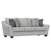 - The Casey sofa steps up to the plate in cozy chenille fabric and understated flair. The classic contemporary frame is updated with flared arms accentuated by welting for a subtle saddle shape. Pillow-shaped back cushions blend the casual appeal of a scatterback with the tidiness of a more traditional box cushion. Upholstered in soft light gray with flecks of dark gray for added depth, this living room collection includes a sofa, loveseat, and chair, accompanied by an accent oval ottoman featuring hidden castors. Flip the top from cushioned upholstery to a dark wood tray to discover hidden storage. Complete the look by tossing on the included accent pillows in a blue and gray geometric print and a textured stripe in shades of navy to make every moment a home run in comfort.