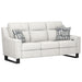 - The Teagan dual power sofa will change your opinion on motion furniture with its trimmed lines, fashionable fabrics, and thoughtful features. Each piece is designed with a contemporary frame and elevated on sleek metal sleigh legs for a modern touch. The sofa goes a step further with a built-in drop-down table featuring stainless steel cupholders and a storage drawer to combine style with practicality. Dual power functionality allows each person to separately adjust the head and foot rests to their optimum comfort. Beige and cream-flecked fabric upholsters the sofa and loveseat while coordinating recliners in a muted brown leather with pvc match or patterned fabric will make you want to put this motion group front and center.