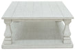 Details Made with hardwood solids, elm veneer, MDF substrates and cast resin, Antiqued white finish, 4 cast resin baluster legs, Open lower shelf, Assembly required