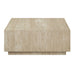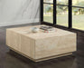 - Timeless Elegance: This square coffee and end table features a natural travertine top, showcasing unique veining and texture that offers a luxurious and elegant look.