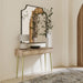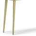 - Features two notched handle soft close drawers and four gold finished metal legs