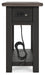 Quality crafted and richly styled, this rectangular chairside end table is sure to charm. Its two-tone aesthetic pairs a weathered grayish brown tabletop with a textured wire brushed base in black. A built-in shelf offers handy display space. And the table's integrated 110V power supply and dual USB charging ports make it so easy to keep your personal devices powered up.