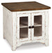 Double take. Sporting a two-tone finish that pairs a distressed vintage white with aged natural pine color, this end table elevates the art of rustic farmhouse living. Enhancing its charm: shelved storage visible through cabinet doors with inset metal grills.