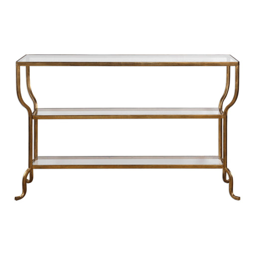 UttermostElegantly Curved Frame Accentuates The Graduated Top Of This Console In Hand Forged Iron With An Antiqued Gold Finish. Shelves Are Clear Tempered G...