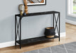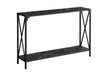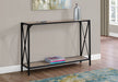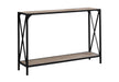 - Design and Finish: The console table features a two-tier design with a rectangular tabletop and bottom shelf, all in a sleek finish. The slender metal frame, also in , includes an X-shaped design on the sides, adding a decorative touch while ensuring sturdiness and stability.