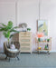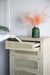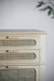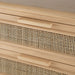 - Unique Materials: Features light pine wood veneer and caning inset on the drawers, offering a bohemian feel with mid-century flair.
