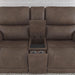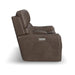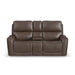 Power up and enjoy secretive perks with the Carter power reclining loveseat with console. Customize your comfort with adjustable recline, headrest and lumbar support on both seats, including reclining to a Zero Gravity position for a weightless experience, reducing pressure on joints. This loveseat will be a statement in your home with its genuine leather look that is a durable, easy to clean fabric in a cappuccino brown color, and Flexsteel's patented Blue Steel Spring™ at the heart of each seat for ultimate durability. Flared arms, a contoured seats and heavy thread stitching details give it a sleek, yet striking look. And it all comes with discreet storage perks, including pop-out cupholders in the arms and a center storage console and a wireless charging pad.