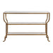 Elegantly Curved Frame Accentuates The Graduated Top Of This Console In Hand Forged Iron With An Antiqued Gold Finish. Shelves Are Clear Tempered Glass.