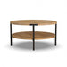 Sophistication meets rustic, industrial charm with the Millwork round coffee table. Seamlessly blending high-contrast materials and finishes in perfect harmony, this table makes a captivating statement in any living space. A textured steel frame is highlighted by warm copper undertones, while a distinctive wood top and lower shelf exude character with natural knots, subtle saw marks and a white cerused finish that accentuates the rich umber wood grain.