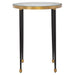 The Stiletto Side Table Offers Stylish Accent To Your Sofa Or Chair. Constructed From Iron Featuring A Texture Rimmed Top In Antique Gold With Tapered Black Legs With Petite Gold Accents. Top Is Clear Glass.