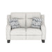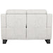 • The Teagan dual power loveseat will change your opinion on motion furniture with its trimmed lines, fashionable fabrics, and thoughtful features. Each piece is designed with a contemporary frame and elevated on sleek metal sleigh legs for a modern touch. The sofa goes a step further with a built-in drop-down table featuring stainless steel cupholders and a storage drawer to combine style with practicality. Dual power functionality allows each person to separately adjust the head and foot rests to their optimum comfort. Beige and cream-flecked fabric upholsters the sofa and loveseat while coordinating recliners in a muted brown leather with pvc match or patterned fabric will make you want to put this motion group front and center.