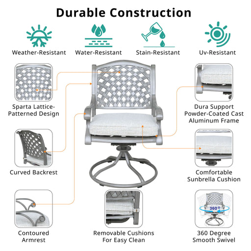 Home EssentialsStylish Dining ChairsEnhance your patio with a set of 2 dining chairs in a sophisticated cast silver finish. Swivel FeatureEnjoy the convenience...