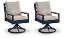 Easy-breezy beauty, made to withstand the elements. With its soothing shade of blue and contrasting wood-look arms, this outdoor swivel rocker dining chair makes a serene statement on your deck or patio. A cushioned seat and back keep you comfy as you lounge. Crafted with durable materials for added longevity, it's a smartly stylish addition to your outdoor oasis.