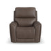 Power up and enjoy secretive perks with the Carter power recliner. Customize your comfort with adjustable recline, headrest and lumbar support, including reclining to a Zero Gravity position for a weightless experience, reducing pressure on joints. This recliner will be a statement in your home with its genuine leather look that is a durable, easy to clean fabric in a cappuccino brown color, and Flexsteel's patented Blue Steel Spring™ at the heart of its seat for ultimate durability. Flared arms, a contoured seat and heavy thread stitching details give it a sleek, yet striking look. And it all comes with pop-out cupholders in the arms for discreet storage.