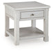 This end table is sure to impress with its timeless traditional vibe. Thanks to the antiqued white finish and wood grain texture, modern farmhouse design has never been so fashionable. The smooth-gliding drawer is ideal for stowing items out of sight, while the bottom shelf provides ample space for books or decor. This versatile piece makes it so easy to eat, work or play from the comfort of your sofa.