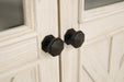 | Details | Made of veneers, wood and engineered wood, Two-tone finish (weathered oak top over antiqued white), 2 side cabinets with 2 adjustable shelves each, 1 center cabinet with 2 doors and 2 adjustable shelves, Cabinet doors with glass inlays, Black faceted hardware, Cutouts for wire management | |