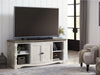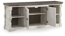 Set your sights on modern farmhouse style with this XL TV stand. Distressed two-tone treatment blends a weathered gray with vintage white for an utterly charming effect. Turned posts lend a hearty, substantial look that feels right at home, while plenty of open shelving makes the aesthetic anything but heavy.