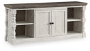 Details Made of pine wood, pine veneers and engineered wood, Two-tone distressed finish: weathered gray top; vintage white base, TV stand with 2-door cabinet with single-shelf storage and 2 open shelves, Aged iron-color hardware, Cutouts for wire management, Assembly required