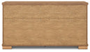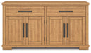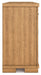 Details Made with rubberwood solids, distressed pine veneers and MDF substrates, Distressed light brown pine finish, Metal bar pulls with black finish, Top surface with distressed planked effect, 4-door cabinet with 2 adjustable wood shelves, 2 drawers with black felt bottoms, fully finished interiors and ball-bearing side glides