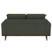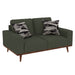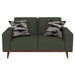 - The Heath loveseat takes relaxation to a whole new level. As you sink into the supportive cushions, you’ll appreciate the dark walnut-toned solid wood trim, tapered legs, and track arms that give this mid-century modern collection its sophisticated edge. Available in rich dark green, striking navy blue, and soft cream, each upholstery choice enhances the natural beauty of the exposed wood and complements any decor. Mix and match these colors to create your own set, with included abstract print accent pillows that tie the look together. With fixed back and seat cushions supported by sinuous springs and individually pocketed coils, this collection promises lasting comfort and style.