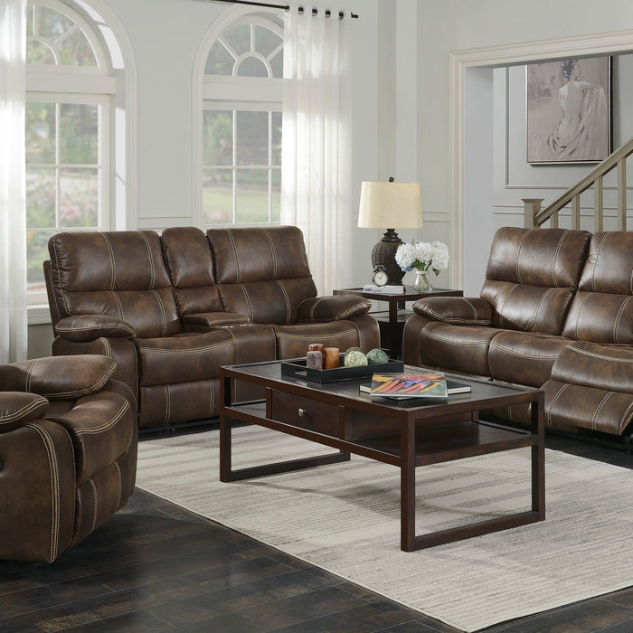 The Jessie James motion collection offers luxury and style with ultimate comfort and convenience. The richly colored faux leather is contrasted by white topstitching creating an eye-catching detail. The well-positioned recline feature handle blends in nicely, offering modern amenities within a traditional design. You can have comfort without sacrificing style with the Jessie James collection.