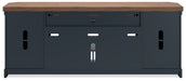 This TV stand combines casual contemporary design with modern appeal. Its combination of a thick-bodied wood-tone top with a slate blue cabinet is a smart choice on so many levels. Stow away electronics in the roomy cabinets, and use the upper shelf to conceal a soundbar speaker for a clean integrated look. Enhancing the experience: the optional fireplace insert (sold separately) brings a touch of warmth and beautiful ambiance to your living room.