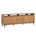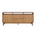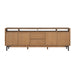 Sophistication meets rustic, industrial charm with the Millwork entertainment center. Seamlessly blending high-contrast materials and finishes in perfect harmony, this piece makes a captivating statement in any living space. A textured steel frame is highlighted by warm copper undertones, while a distinctive 76” wood top exudes character with natural knots, subtle saw marks and a cerused finish that accentuates the rich umber wood grain. Above the drawers and cabinets, open shelving offers both form and function, perfect for displaying curated décor, housing media components, or keeping everyday essentials within reach while maintaining an airy, balanced silhouette.